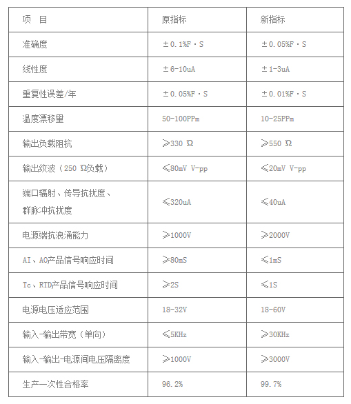 我司研發(fā)、質(zhì)量、生產(chǎn)、工藝、工程等部門充分協(xié)作,在調(diào)研、征求了大量客戶意見、詳細(xì)分析了在海內(nèi)外約260萬只產(chǎn)品的應(yīng)用情況后,以我公司十五年的技術(shù)積累為基礎(chǔ),應(yīng)用了我司多項先進(jìn)、并經(jīng)充分驗證的技術(shù)成果,對接國內(nèi)、國際最新技術(shù)標(biāo)準(zhǔn),并引進(jìn)了專業(yè)產(chǎn)品可靠性分析團(tuán)隊,通過數(shù)百次嚴(yán)格試驗及研發(fā)后期在各行業(yè)近萬只樣機(jī)的試用,歷經(jīng)數(shù)十次改進(jìn)后,新C系列隔離器、配電器、溫度變送器系列產(chǎn)品最終得以成功定型,其中申請發(fā)明、實用新型專利十余項、軟件著作權(quán)三項。新C系列產(chǎn)品的各項重要技術(shù)、可靠性等指標(biāo)較老產(chǎn)品有了質(zhì)的提升(見下表)。