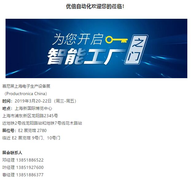 Productronica China特約展商南京優(yōu)倍自動化系統(tǒng)有限公司(簡稱:優(yōu)倍自動化)以“電子產(chǎn)線MES與裝備集”成為展示主線,基于智能制造,啟用大型電子看板、軟件使用體驗(yàn)、現(xiàn)場問答、案例回顧解析等方式,向來賓全面展示優(yōu)倍MES V2.0系統(tǒng)版本所具備的八大功能模塊:物料管理、產(chǎn)品工藝、生產(chǎn)管理、質(zhì)量管理、設(shè)備管理、可視化管理、信息集成、系統(tǒng)管理。