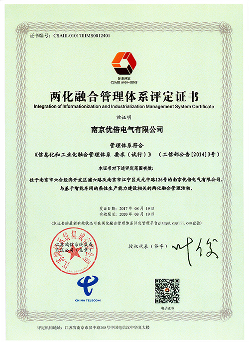 優(yōu)倍電氣2014年入選工信部?jī)苫疃热诤显圏c(diǎn)單位,按照工信部《信息化和工業(yè)化深度融合專項(xiàng)行動(dòng)計(jì)劃(2013-2018年)》相關(guān)要求,于2016年初啟動(dòng)了兩化融合管理體系貫標(biāo)工作,全面推進(jìn)兩化融合管理體系建設(shè)。